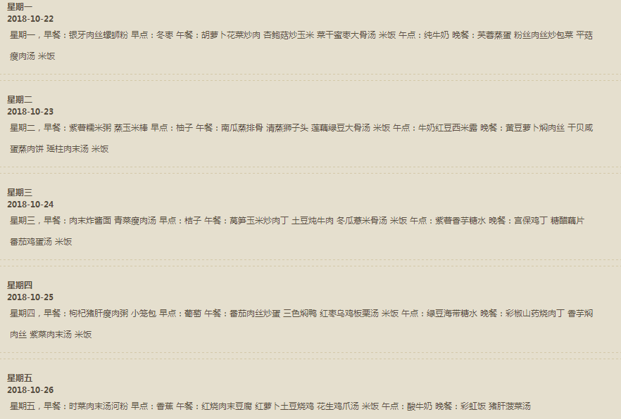 乐恩幼儿园2018.10.22-10.26一周食谱