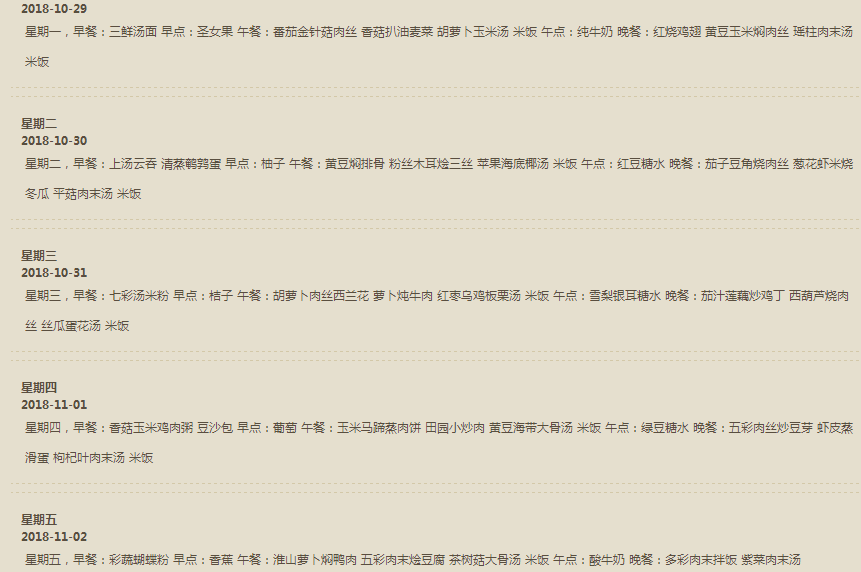 乐恩幼儿园2018.10.29-11.2一周食谱