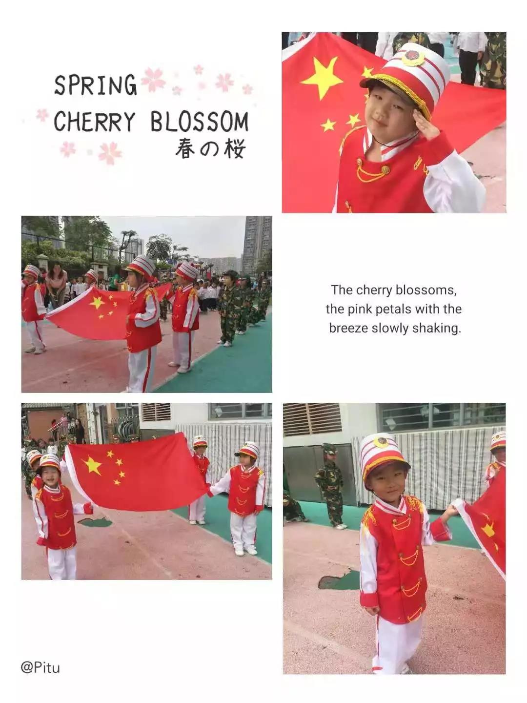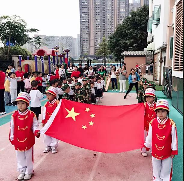 他们穿着整齐,在老师的带领下,抬头挺胸,将国旗高高地举起,踏着有力而坚定的步伐走向升旗台,并带领着全体老师和小朋友一起宣誓“我爱五星红旗,国旗在我心中”