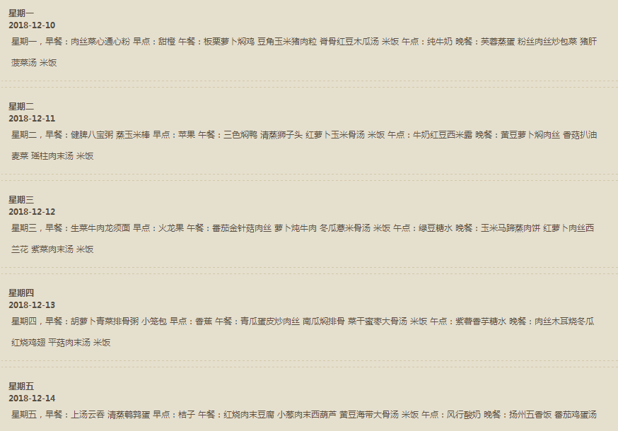 乐恩幼儿园2018.12.10-12.14一周食谱
