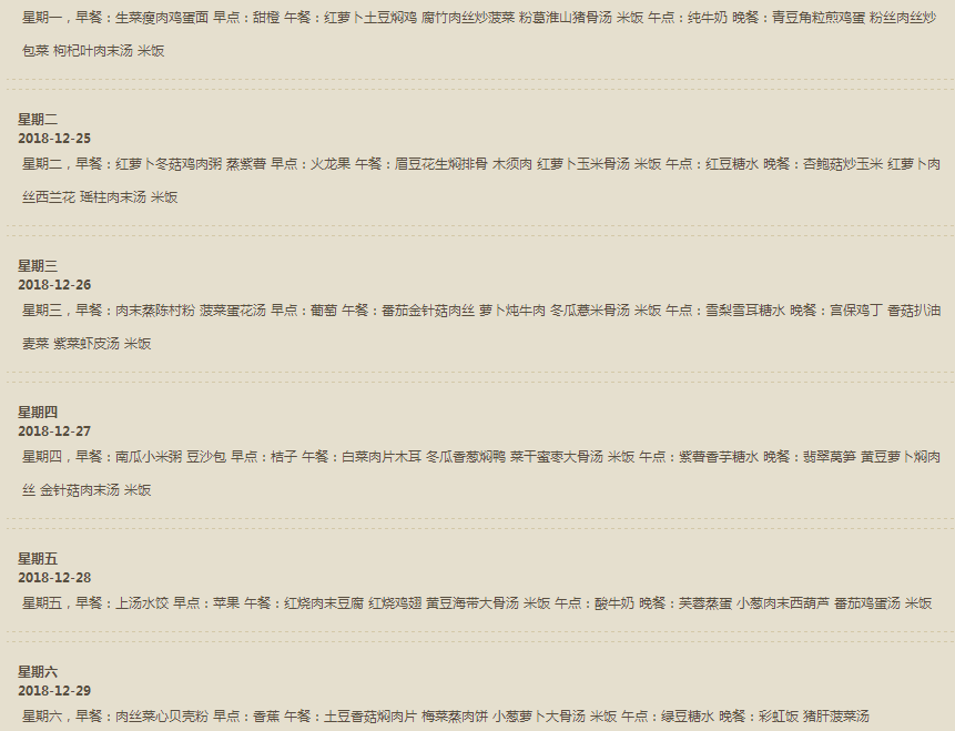 乐恩幼儿园2018.12.24-12.29一周食谱
