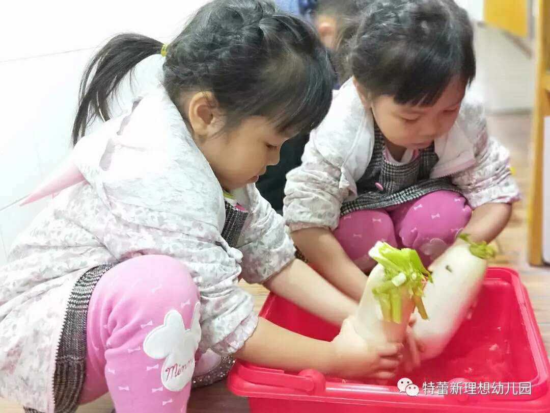 NO.1洗萝卜和蔬菜 食材准备好了,宝贝们都迫不及待的想动手了!洗萝卜之前要把萝卜的叶子、萝卜的“尾巴”、还有萝卜的“胡须”