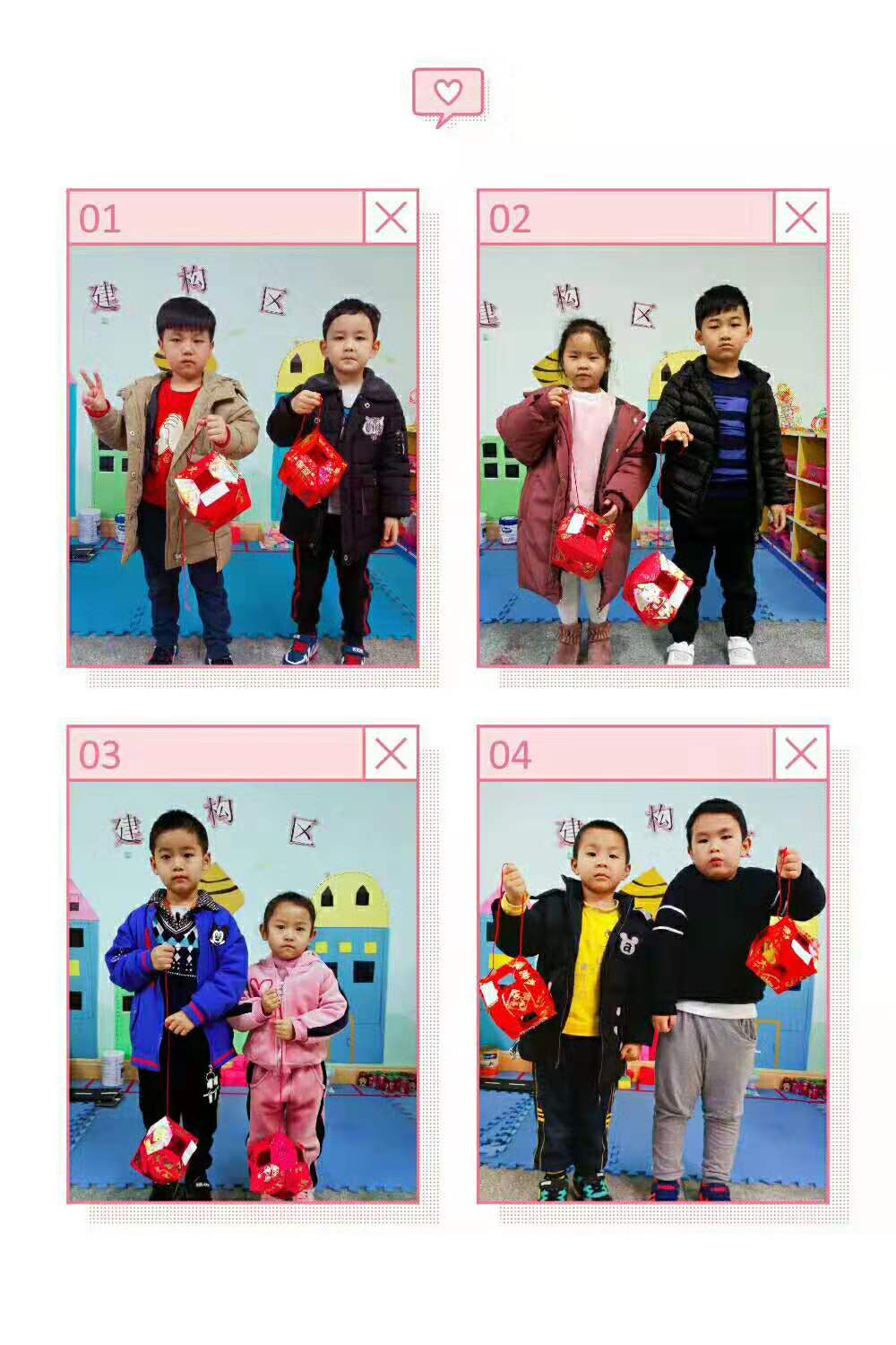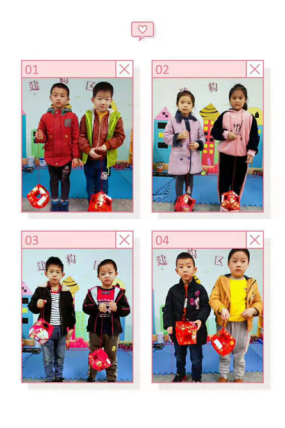 美术活动的特点在于操作性强,动手需求大,这刚好符合幼儿好动的特点。制作成功后的孩子们成就感很大,也慢慢树立起孩子的自信心,在放学时不少小朋友都指着自己的作品和接他们的大人说:“看!这是我做的图形灯笼!”从他们的表情中我看到,他们收获了制作成功的成就感与自豪!