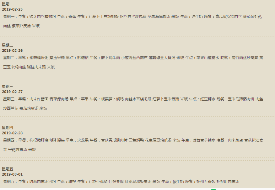 乐恩幼儿园2019.2.25-3.1一周食谱