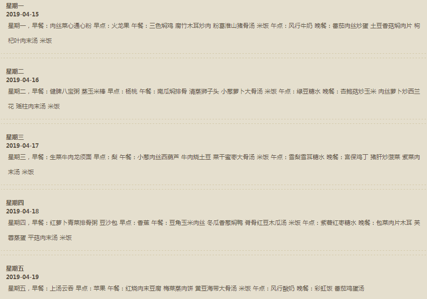 乐恩幼儿园2019.4.15-4.19一周食谱