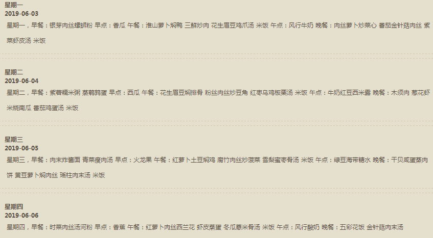 乐恩幼儿园2019.6.3-6.6一周食谱