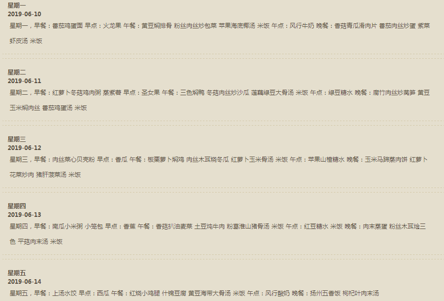 乐恩幼儿园2019.6.10-6.14一周食谱