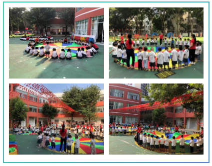 小班可爱的孩子们的早操的主题结合了“彩虹伞”而展开,主要围绕着彩虹伞玩游戏而编排,并根据幼儿已有的经验,锻炼孩子爬、走、躺等动作。